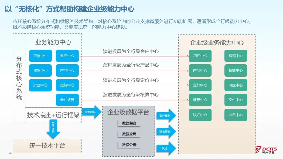 一是打破系统边界,从单一的纵向能力支撑走向中台化的能力横向覆盖。在企业级数据平台支撑下,真正形成覆盖全行业务系统的能力中心。